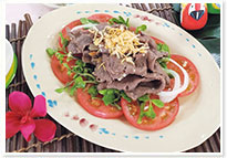 ベトナムの万能漬けだれ「ヌックチャム」を使ったサラダです。タマネギは極薄切りにして水にさらし、辛味を抜くと食べやすくなります。
