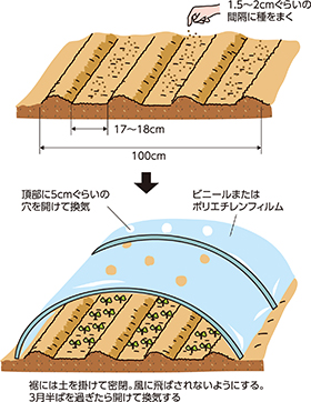 種のまき方は、畑に1m幅のベッドを作り、全面に完熟堆肥と菜種油かす、化成肥料を均一になるようにばらまき、15cmほどの深さによく耕し込みます。そしてまき溝をくわ幅よりやや広め(17~18cmぐらい)に3列、溝底が平らになるよう丁寧に作り、溝の外にはみ出さないよう注意しながら、ジョウロでたっぷり灌水(かんすい)しておきます。発芽ぞろいまでトンネルは除覆しないので、このことを考えて十分に灌水してください。