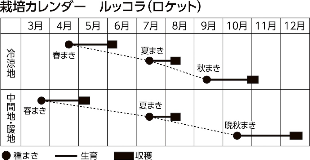 各社から「ルッコラ」または「ロケット」として販売されています。なお、ルッコラの野生種といわれるセルバチコには、葉が細くとがり香りが特に強い品種「ローマ」(トキタ種苗)もあります。