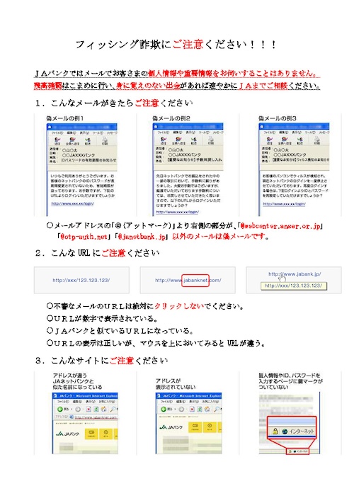 JAバンクを装った詐欺メールをお客さまへ送信し、リンク先より偽サイトに誘導して、JAネットバンクのID・パスワード等を盗み取り、不正に送金を行う犯罪が発生しています。